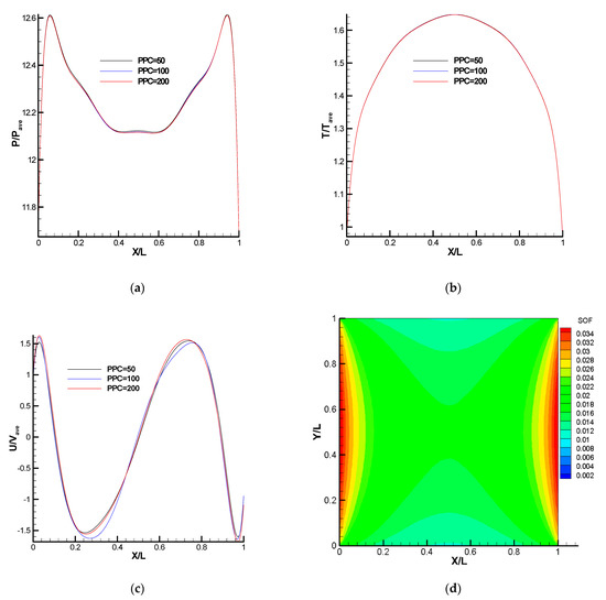 The particle per cell (PPC) independence test is reported in Figure 4 for case 1. PPC values of 50, 100, and 200 were used to analyze three cases. The chart demonstrates that there was little to no difference in the data from the three PPCs used for pressure and temperature. There was a slight difference between PPC = 100 and 50 and 200 at the dips and peaks in the U-velocity profile. Therefore, for the simulations described in this paper, we employed at least PPC = 100.