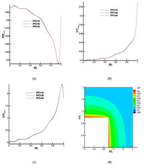The PPC independence test is depicted in Figure 5 for case 2. PPC values of 15, 30, and 45 were used to analyze three simulations. The chart demonstrates there was little to no difference in the data from the three PPCs used for the pressure and temperature. There was a small difference at the beginning of the graph in the U-velocity. Therefore, for the simulations described in this paper, we employed at least PPC = 30. The contour separation of free pathways or (SOF) is displayed in Figure 5d. Similarly to case 1, values of SOF were less than 0.3, indicating particles were sufficient in this domain and the collisions were modeled accurately, according to Bird [7].