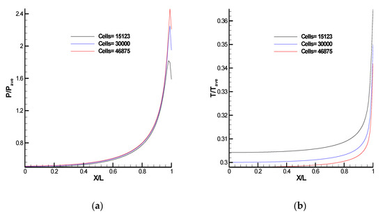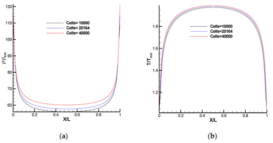 In case 1, the square geometry was divided into small areas using structured cells. To obtain accurate results, the mean free path of gas molecules should be larger than the size of the cells [4,5,6,7,8], and the grid size and particle per cell (PPC) should be adequate. The normalized density and temperature are shown in Figure 2 at Kn = 0.1 on the cavity’s bottom side. We used three different grid sizes, with maximum cell sizes of 0.13λ, 0.1λ, and 0.07λ; i.e., grids of 5184, 10,000, and 20,164 cells were employed to show the grid independence of the solutions. Density and temperature were normalized to the average density and average temperature. The frames in Figure 2 show the nearly identical results for the three grid sizes; thus, the grid with 10,000 cells was used to solve this test case.