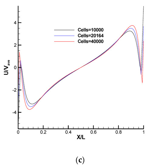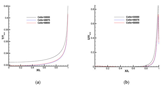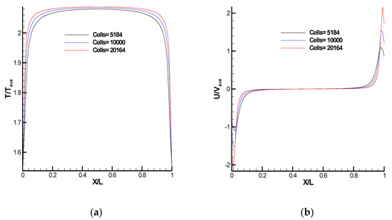 Since the DSMC solver is time-consuming at low Knudsen numbers, the DUGKS method was used to examine the properties of the flow field at small Kn for case 1. Three independent grid sizes of 10,000, 20,164, and 40,000 cells, with a Gauss–Hermit quadrature expansion using a velocity grid of 28 28 cells, were evaluated. All cases had a Courant–Friedrichs–Lewy (CFL) number of 0.5. Figure 6 displays the normalized density, temperature, and U-velocity distribution on the bottom side of the square cavity at Kn = 0.01. There was little difference in the three used grid sizes for density, temperature, and U-velocity, but the lines show a converging trend. Thus, we used a grid size of 10,000 cells to solve the problem.