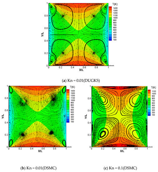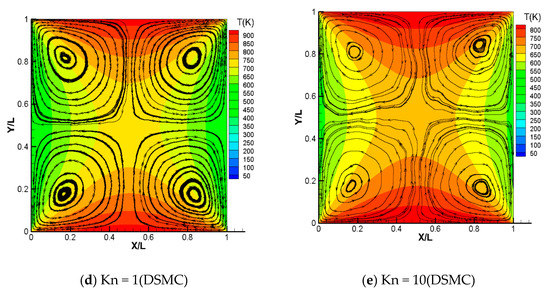 The streamlines produced by the DSMC and DUGKS solvers are displayed in Figure 15 for Kn = 0.01, 0.1, 1, and 10. DUGKS was used to obtain the Kn = 0.01, and the DSMC solver provided the others. At all Knudsen numbers, the realm was entirely dominated by two enormous vortices. Due to the non-straight isothermal curves and the significant temperature differential |TH -TC|/TC, these vortices were most likely the result of nonlinear thermal stress effects.
