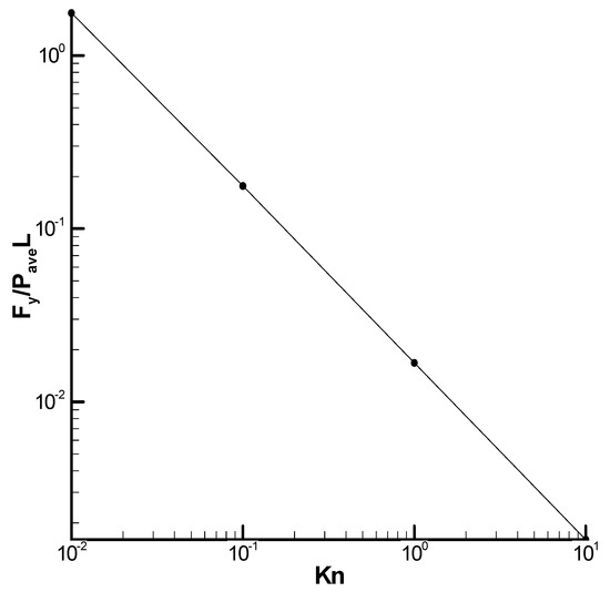 The normalized normal force on the bottom wall for a wide range of Knudsen numbers is shown in Figure 12. The axial force’s order is substantially lower than the normal force’s order. The graph shows that when Kn increases, the normal force decreases. This indicates that even when the size of the vortices grows as Kn rises, the generated flow reduces as the vortices’ strength falls and the temperature gradient becomes weaker. By taking into account the average velocity in the domain, as shown in Figure 5, this can be further substantiated. For the entire range of the investigation, the curve fitting to the normalized force exhibits a dependence on 1/Kn. Therefore, throughout the problem’s explored range, the combined effects of the temperature gradient and Knudsen number dependency yield a force that drops with 1/Kn.