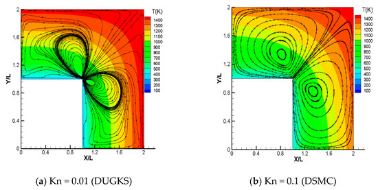 In Case 2, the streamlines in the cavity from the SNIT predictions at Kn = 0.01 are depicted in Figure 19. Large vortices in the cavity are seen in the simulation results and were caused by nonlinear thermal stress flow. In the SNIT predictions, two small vortices appear close to the top right corner. These could be Moffat vortices growing close to the rectangular bend’s corners. Due to the abrupt change in geometry and boundary temperature near the corners, the SNIT equations are invalid, making the tiny vortices nonphysical.
