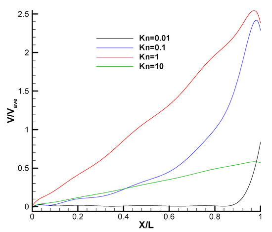 The velocity profile over a horizontal line for the range of Kn = 0.01 to Kn = 10 is shown in Figure 11 on the bottom side’s cavity. There is a concavity at Kn = 1, 0.01, which becomes deeper at Kn = 0.01. As it moves toward the side’s center, the velocity decreases at Kn = 10, until X/L = 0.5, which is zero. There are three concavities at Kn = 0.1. The local maximum velocity at Kn = 1 is higher in comparison with other Knudsen numbers.