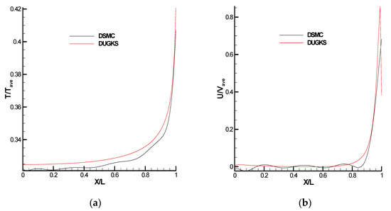 In Case 2 at Kn = 0.01, Figure 18 compares the velocity profile and temperature on the rectangular bend’s cold surface. As seen in Figure 18, both solvers produced nearly identical results. The temperature fields of the two solvers varied slightly, as the values obtained by the DUGKS solver were larger than DSMC’s, which might be because the two solvers use different temperature models. The DUGKS and DSMC solvers are based on the Shakhov model and the Boltzmann equations, respectively, so a slight difference is acceptable.