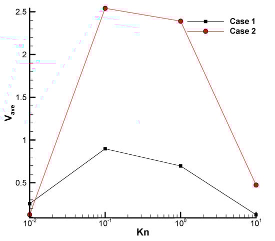 The average velocity magnitude for cases 1 and 2 is shown in Figure 20 for various Knudsen numbers. The average velocity trend is nearly the same in both cases, as the maximum average velocity is reached at Kn = 0.1, and then decreases. In both cases, the velocity average increases until Kn = 0.1, and falls with a different slope, as the incline of case 2 at 1 < Kn < 10 is greater in comparison with case 1.