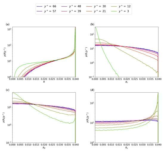 Figure 5. Panels (a)–(d), which correspond to different components of the end-to-end vector, show that the pdfs peak at the maximum length, independently of the distance from the wall, testifying that a large fraction of the polymer population (≈
