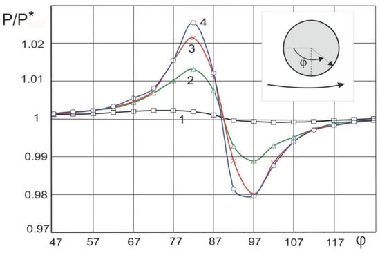 Pressure on the surface of inner cylinder. Angle φ = 90° corresponds to minimum gap along H line. Pressure is normalized with atmospheric pressure (P*). 1–H = 0.5 mm, 2–H=0.3 mm, 3–H = 0.2 mm (Re = ω∙R2∙H/ν = 0.001), 4–H = 0.1 mm.