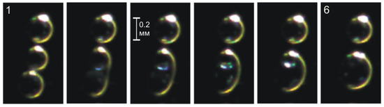 Figure 6 shows frames of an aluminum powder particle tracking in the secondary circulation region ahead of the cavitation chain. In this area, before the line of the minimum gap between the cylinders, the flow is compressed, and part of it goes back along the surface of the inner cylinder, which corresponds to the circulation region O1 in Figure 1. The cavitation chain is located behind the line of the minimum gap H in the area of flow expansion.
