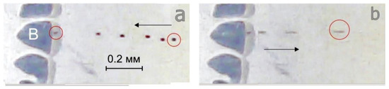 Reverse flow tracks along the surface of the inner cylinder behind cavitation bubbles B. The main flow moves from left to right. (a)-flow of the particle to the gas bubble, (b)-flow tracks after the flow direction change near the gas bubble in the direction of the main flow. Diameter of the inner cylinder is 25 mm (Re = 0.005). Tracking particles are marked with red circles.