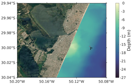 As mentioned, the objective of this study is to evaluate, using an overtopping WEC, the energy potential that can be harnessed in the sea waves in the coastal region of the municipality of Tramandaí, located on the North Coast of the State of Rio Grande do Sul, Brazil. For this, the WaveMIMO methodology [16] was used to obtain data from the coast of Tramandaí at the point of longitude 50°66.86 W and latitude 29°5953.38 S (see point P in Figure 2), which has a depth of 12.97 m and is located 2391.98 m from the coast.