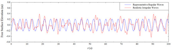 Then, the sea state spectrum is transformed into free surface elevation series, applying the inverse Fourier transform to the sea state spectrum [45]. More details about this methodology can be found in Oleinik et al. [18] and Machado et al. [16]. In Figure 6, it is possible to visualize the first 100 s of the free surface elevation time series of the representative regular waves (obtained through Equation (1)) and realistic irregular waves (obtained from TOMAWAC) of the adopted sea state (see Figure 4 and Figure 5). As expected, representative regular waves show a stable cyclic behavior, being a simplification of the real phenomenon; while realistic irregular waves show an unstable behavior, representing more faithfully the sea state that occurs in nature. It was observed that, in general, when compared to representative regular waves, realistic irregular waves present considerable differences regarding the elevation of crests and troughs. It can also be observed that some crests and troughs of realistic irregular waves have approximately twice the amplitude of crests and troughs of representative regular waves. Finally, it is noteworthy that the waves were obtained from the unimodal variance spectrum, which occurred in the municipality of Tramandaí, Brazil, on April 7, 2019 (see Figure 4 and Figure 5).