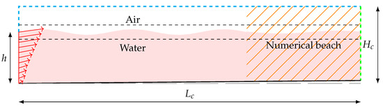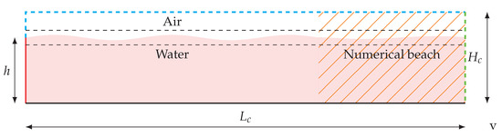 Regarding the initial conditions, it was considered that the fluid is at rest and that the water free surface has depth h. As for the boundary conditions shown in Figure 7, on the left side of the channel (red line), a velocity inlet boundary condition was assigned, generated by the imposition of a velocity field given through Equations (4) and (5). In the upper region of the left wall of the channel, as well as on its upper surface (blue line), the pressure outlet boundary condition was assigned; on the bottom, the velocities are prescribed as zero, i.e., the non-slip and impermeability boundary conditions were adopted. Finally, on the right side (green line), the hydrostatic profile condition (pressure outlet) was imposed; this boundary condition receives a distinct nomenclature because it will act as the numerical beach (orange hatching).