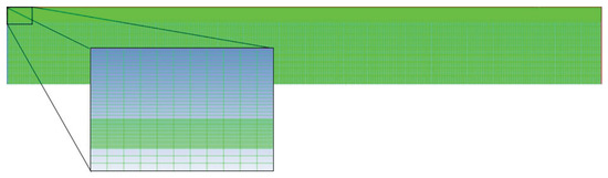 Regarding the spatial discretization, following recommendations from the literature [47,48], a stretched mesh was used, which applies a greater refinement in the free surface region. Thus, the computational domain was divided vertically into three regions and horizontally into one region. As for vertical discretization, the region above the free surface, which contains only air, was subdivided into 20 mesh volumes; the free surface region, which contains the air-water interface, was subdivided into 20 volumes per wave height (/20, see Table 1); and the region below the free surface, which contains only water, was subdivided into 60 volumes. With respect to the horizontal discretization, a parameter of 50 volumes per wavelength was adopted (L/50, see Table 1). The discretization of the computational domain is shown in Figure 8.