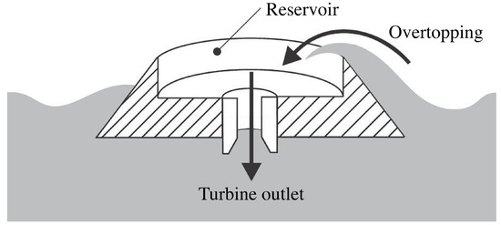This study aims to evaluate the available power obtained by an overtopping WEC (see Figure 10) when subjected to a realistic sea state presented in the coastal region of Tramandaí. In this device, whose working principle is based on a reservoir raised in relation to the MWL, waves hit and climb a ramp, due to their energy, transporting volumes of water to the reservoir. The accumulated water mass, when returned to the sea, drives low head hydraulic turbines coupled to electric generators. Thus, the device converts kinetic energy from the waves into electrical energy [49].