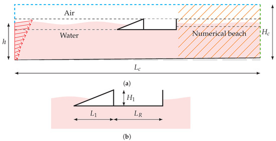 where is the linear damping coefficient (s), is the quadratic damping coefficient (m), V is the fluid velocity at a given point (m/s), and , , , and are the free surface, bottom, starting, and ending points of the numerical beach domain (m), respectively. It is noteworthy that recommendations from the literature were adopted [46], regarding coefficients = 20 s and = 0, as well as the numerical beach length, which was defined as 2L.