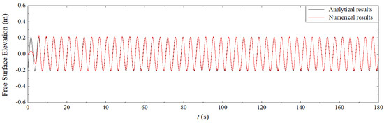 To verify the generation of representative regular waves, the numerical solution of water free surface elevation was compared with the analytical wave obtained through Equation (1). It is worth noting that the analytically generated waves have the same characteristics as the numerical waves, which can be observed in Table 1. To compare numerical and analytical results, mean absolute error (MAE) and root mean square error (RMSE) metrics were used, according to the following equations [56]: