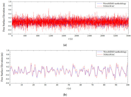 Verification of the generation of realistic irregular waves by comparing free surface elevation series obtained from the WaveMIMO methodology in Fluent and TOMAWAC considering: (a) 3600 s of simulation and (b) detail of the first 100 s of simulation.