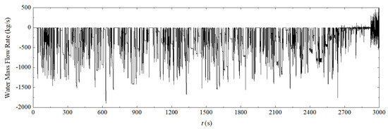 Instantaneous water mass flow as a function of time, considering 3000 s.