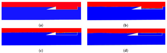 Figure 15 presents the transient behavior of the time series of realistic irregular waves generated in the numerical wave channel, where it is possible to observe the water phase (in blue) and the air phase (in red). The fluid dynamic behavior was obtained for the following time instants: t = 0 s, 630 s, 2200 s, and 2673 s. For the initial instant, Figure 15a, one can visualize the initial condition of the wave channel and infer that the device reservoir does not contain water. In Figure 15b, which shows the approximate instant of occurrence of the highest overtopping discharge, it is possible to notice a mass of water accumulating inside the reservoir. In Figure 15c, the approximate time in which the lowest overtopping discharge occurs, it is possible to visualize a wave incidence on the device ramp and a greater mass of water in the reservoir. Finally, in Figure 15d, it is possible to observe the instant when the device reservoir overflows due to the volume of water.