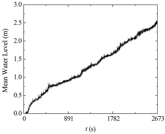 In Figure 16, there is a linear trend in the water level elevation inside the reservoir, indicating that the amount of water overtopped presents a cyclical behavior during the 2673 s of the simulation. This behavior is in agreement with those obtained in previous investigations, as in Hubner et al. [26] and Jin et al. [57]. Thus, mean water level inside the reservoir can be described by Equation (20), with an adjustment factor = 0.994:
