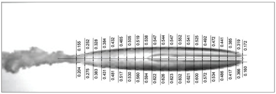 Figure 8 and Figure 9 show the change in the length and diameter of the cavitation with cavitation numbers for four cases. The length and the diameter of the cavitation are measured three times in order to reduce the uncertainty of the measurement. The length and diameter of the cavitation are nondimensionalized by the diameter of the projectile. The abscissa is the cavitation number, which was calculated with Equation (4). Figure 8 and Figure 9 show that both the length and diameter of the cavity decreased with the increase in cavitation number, that is, the size of the cavity decreased with the increase in cavitation number.