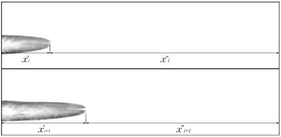 The velocity of the projectile can be calculated according to the displacement difference and the time difference between the positions of the projectile in two different frames. In order to reduce the error, projectile velocities and were first calculated with the left and right reference planes, respectively. Then, average value was taken as the velocity of the projectile. The schematic diagram of displacement measurement is shown in Figure 3. The formula for calculating the velocity of the projectile is as follows: