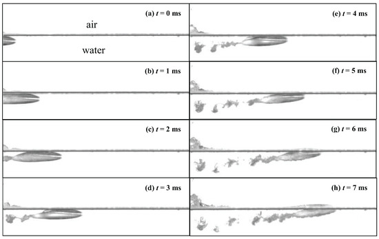 The influence of hydrophilic projectile on free surface is different from that of hydrophobic projectile. Figure 5c–f show the splash phenomenon on the left side of the picture, but no obvious deformation can be observed on the free surface above the projectile. In Figure 5g, the head of the projectile was close to the free surface, and at that time, the free surface above the projectile rose. Figure 5h shows the projectile starting to come out of the water.