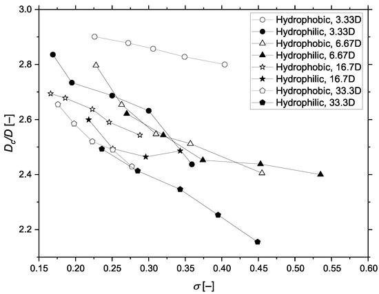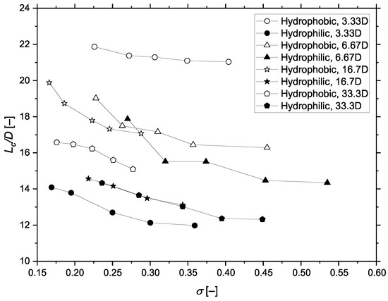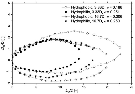 Figure 8 shows that the cavitation length of hydrophobic projectile was larger than that of hydrophilic projectile for the case of the same water depth. At the same cavitation number, the length of cavitation decreased with the increase in water depth (except the case of 3.33D with the hydrophilic coating). Near the free surface (3.33D water depth), the cavitation length on the hydrophobic projectile was much longer than that on the hydrophilic one, which may have mainly been due to the fact that the position of the projectile is close to the free surface, and the cavitation of the hydrophobic projectile could expand towards the free surface. However, for the hydrophilic projectile, the expansion of the cavity toward the free surface was not observed.