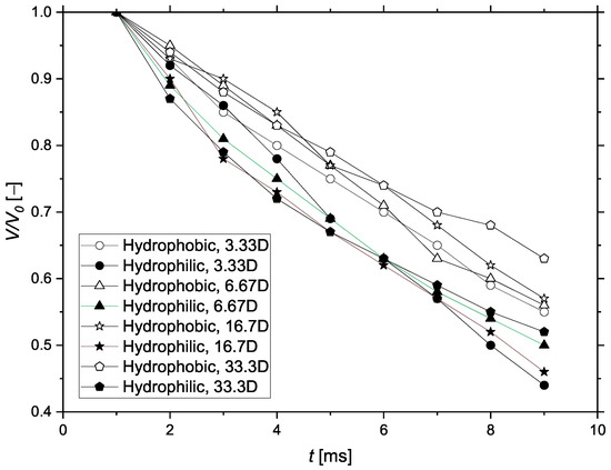 Figure 11 shows the change of the projectile velocity with time for both hydrophilic and hydrophobic coatings at different water depths. The velocity was nondimensionalized by the initial velocity of the projectile under different conditions.