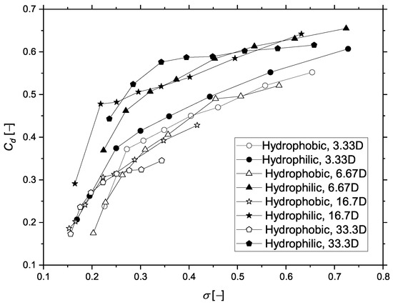 Figure 12 shows the relationship between the drag coefficient and the cavitation number for different conditions. The calculation of the cavitation number and drag coefficient is given in Equations (4) and (5). Figure 12 shows that, for every condition, the drag coefficient of the projectile increased with the increase in cavitation number, while the drag coefficient of the hydrophobic-coated projectile was lower than that of the hydrophilic coating in every water depth. For projectiles with different coatings, even though the cavitation number was the same, the drag coefficient on the projectiles was also different. This was due to the different shapes of the cavitation wrapped on different coated projectiles. Under the working conditions of 6.67D, 16.7D, and 33.3D, the drag coefficient of hydrophobic projectile could be reduced by 20–40% at a certain cavitation number compared with that of hydrophilic projectile. Near the free surface, the reduction in the drag coefficient due to the hydrophobic effect is slightly smaller compared with the other conditions of water depths. In the studied working conditions, at the water depth of 33.3D and = 0.34, the drag reduction in hydrophobic projectile reaches its maximum, about 40%, compared with that of hydrophilic projectile.