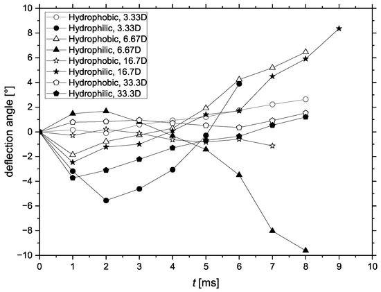For hydrophobic projectiles, in the cases of 3.33D, 16.7D, and 33.3D, the deflection angles of the projectiles were all small, about 2°. For the case of 6.66D, the deflection angle of the projectile reached about 6° at t = 8 ms. However, Figure 14 shows that the deflection angular rate of the projectile decreased from t = 6 ms to t = 8 ms.