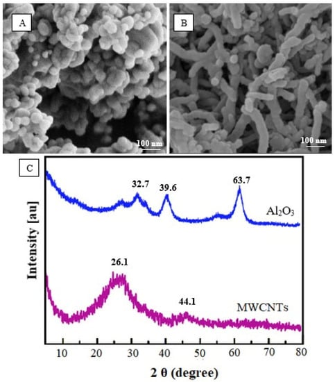 Characteristics of the nanoparticle additives: (A) SEM image of Al2O3 NPs; (B) SEM image of MWCNTs, and (C) XRD patterns of Al2O3 NPs and MWCNTs.