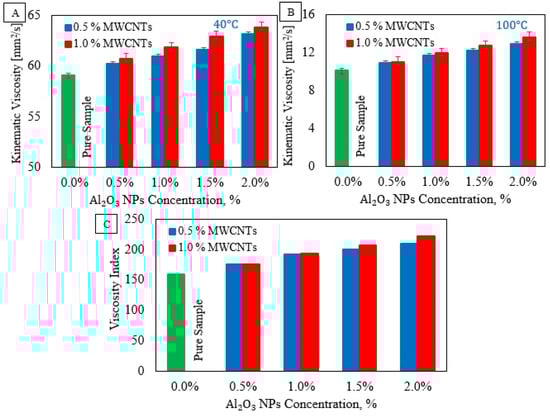 The effect of the dispersion of the hybrid Al2O3/MWCNTs in lubricating oil on the kinematic viscosity was studied at the test temperatures of 40 °C and 100 °C. A kinematic viscosity value was assumed for each sample for comparison with the additive-free oil sample. Figure 2A,B shows the kinematic viscosity of all nano lubricant samples at the temperatures of 40 °C and 100 °C. It can be seen that the kinematic viscosity increased significantly with the increase in the hybrid filler content. Moreover, the highest value of kinematic viscosity was measured when using a higher filler content. The viscosity increases of the samples loaded with 2.0 wt.% Al2O3 NPs and 0.5 wt.% MWCNTs were 6.8% and 2.8% at the temperatures of 40 °C and 100 °C, respectively. The dispersions loaded with 2.0 wt.% Al2O3 NPs and 1.0 wt.% MWCNTs increased the kinematic viscosity by 8.0% and 3.5% at the test temperatures of 40 °C and 100 °C, respectively. This could have been due to the presence of nanoparticles between the oil layers, which contributed to the improvement of the viscosity. Moreover, the phenomena of agglomeration and collision of particles contribute to the increase in the viscosity of oil even at high temperatures []. The results obtained by many researchers are in agreement [,,].