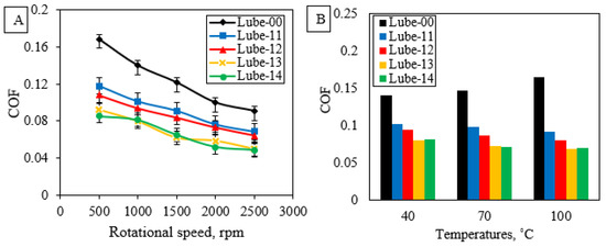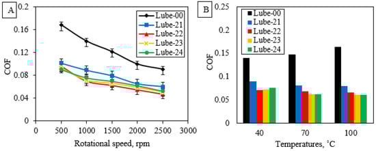 The friction coefficient of hybrid nano lubricant samples with various loading contents of 0.5 to 2 wt% Al2O3 NPs and 0.5 wt% MWCNTs (A) at different speeds and (B) at different temperatures.
