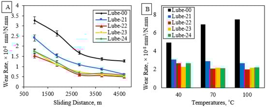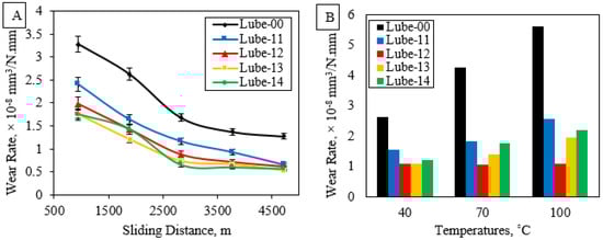 The wear rate was evaluated in the samples loaded with hybrid Al2O3 NPs and MWCNTs as a function of the working conditions. Figure 5 shows the effect of adding the Al2O3/MWCNT hybrid nanofiller to engine oil on the wear rate at a constant load of 200 N, different sliding paths, and temperatures of 40, 70, and 100 °C. In general, a decrease in the wear rate was observed with the increase in the sliding distance, indicating increased wear resistance. Moreover, the presence of hybrid nanofillers contributes to the reduction in the wear rate at different sliding distances [,]. It can be observed that the dispersed engine oil with 1.5 wt.% Al2O3 NPs and 1.0 wt.% MWCNTs, Lube-13, had the lowest wear rate. The reduction in the wear rate was up to 58% compared with the additive-free sample, Lube-00. On the other hand, an increase in the temperature led to a decrease in viscosity, which reduced wear resistance. This means that care should be taken when using this sample, Lube-00, at high temperatures. Nevertheless, the hybrid nanofiller responded well to the high temperature, which helped to increase the wear resistance. Hybrid fillers play an effective role in reducing the wear rate, which could be due to their properties, such as surface enhancement and the formation of oil nanofilm []. The effect of increasing the MWCNT loading from 0.5% to 1.0 wt.% is shown in Figure 6. It could be assumed that the wear rate decreased with the addition of 1.0 wt.% MWCNTs. This could be attributed to the increase in the MWCNT loading, which may favor the presence of particles on the fibers []. This may have helped to improve the dispersion of the nanofiller in the oil. From the results, dispersion of the samples with 1.0 wt% MWCNTs reduced the wear rate similar to the previous samples. However, these samples showed a significant response at a high temperature when it was set higher than the previous samples. Thus, the wear rate decreased by 70% on average at 100 °C. It was found that the addition of hybrid Al2O3/MWCNTs increased the wear resistance, and the results were also in agreement with previous results [,,,].