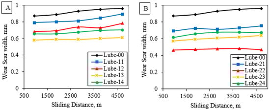 Wear scar width of hybrid nano lubricant samples: (A) 0.5 wt.% MWCNTs and (B) 1.0 wt.% MWCNTs.