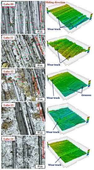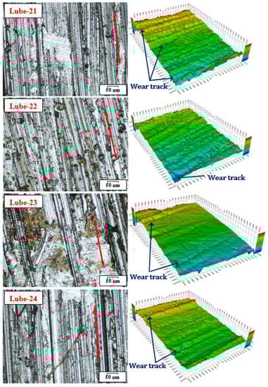 For better illustration, the topography of the worn contact surfaces of the nano lubricant samples is shown in Figure 8 for the loading levels of 0.5% and 1.0% by weight MWCNTs, respectively. The topography of the Lube-00 sample showed the presence of many wear marks and the propagation of the grooves and wear residues. In addition, the 3D topography showed the depth of these traces and the roughness of the friction surface. Moreover, the dispersion of the hybrid nanofiller led to a reduction in the wear marks and their depth, which could have been due to the formation of tribofilm performed by the nano lubricant. It could be observed that the sliding surfaces of the samples filled with Al2O3 NPs and 0.5 wt.% MWCNTs became less rough. Moreover, it could be observed that an oil film was deposited on the sliding surface. This could have been the main reason for the decreases in the COF and the wear rate. The same observations could be confirmed by examining samples with Al2O3 NPs and 0.5 wt% MWCNTs, as shown in Figure 9. Finally, the topography of the sliding surfaces showed that the samples with the nanofiller had cracks, grooves, wear marks, and deposits, and the surface roughness was lower than that of the sample without additive.