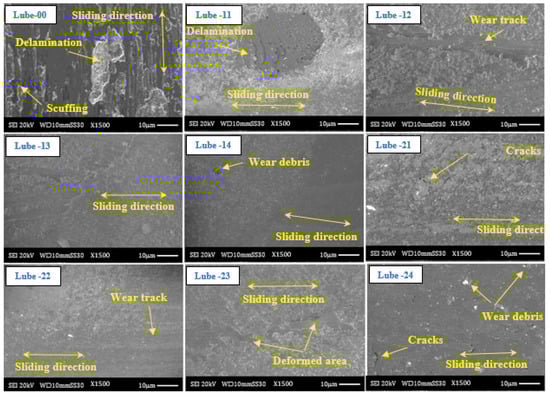 Figure 10 shows the SEM images of the nano lubricant samples. To obtain a clear analysis, all samples were scanned at the same magnification factor. The SEM image of the pure engine oil sample showed clear damage to the sample surface in the form of delamination and scuffing. In contrast, the surfaces of the nano lubricant samples were less damaged and smoother. The surfaces with the least damage were found in Lubricant 13 and Lubricant 22 samples. It could be concluded that these samples had smooth surfaces without wear marks. It could be assumed that the MWCNTs contributed to the improvement of the wear mechanism because they formed tribofilm that separated and prevented metal–metal contact [], while the Al2O3 NPs played an effective role as nano-rolling elements that reduced the COF and repaired the worn surfaces [,].