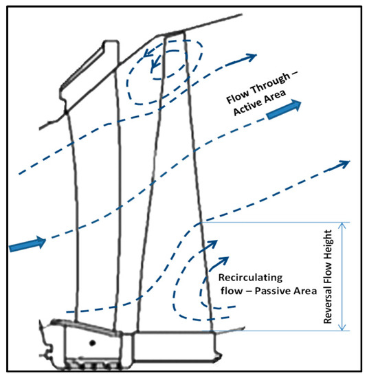 Flow separation starts in correspondence of the blade hub, causing a limited separation in the diffuser cone, as described by Sauchev et al. [9]. There are two different zones that can be identified at the trailing edge of the last-stage moving blades (LSMBs): a reverse-flow region and a through-flow region (Figure 1) [8]. The separated region initially does not have any significant effect on the net power produced by the LSMB. As soon as the volumetric flow reduces, the recirculating region increases, and the reverse flow height increases accordingly [10]. The steam flow starts to be centrifugated in the radial direction, leading to an increase in negative power and flow temperature in correspondence of the tip region of the moving blade. As soon as the dimension of the through-flow region reduces, the net power associated with the last-stage blades decreases accordingly, as reported by Shnee et al. [5]. There is a point where the net power of the last-stage blades becomes negative, producing heat that leads to an increase in flow and blade metal temperatures [11].