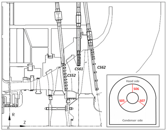 The steam turbine is characterized by four stages (two front stages and two rear stages) and a radial diffuser, which is about 1/3 of the full size. Its configuration and equipment allow for performing detailed measurements relative to the ventilation power absorbed by the penultimate and last stages. Temperature, pressure, and velocity measurements along the blade span were taken on the different planes of CS52, CS61, and CS62, and at the different circumferential locations of S05, S06 and S07 (Figure 2).