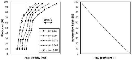 Distribution of the axial velocity along the blade span. (left) Mean values on CS62 plane; (right) mean reverse flow height. Axial velocity and flow coefficient values are not shown for confidentiality reasons.