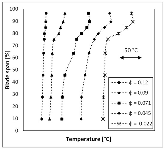 The extension of the reverse-flow height also influenced the temperature field, as shown in Figure 5. The measured temperature distribution shifted towards higher values as soon as the flow coefficient decreased. For each test case, as per usual for low-volume-flow operation, the maximal temperature was reached in the upper part of the blade.