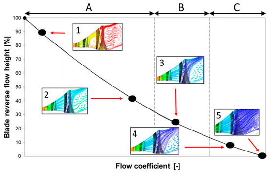 Schematic representation of the variation in blade reverse-flow height for different flow coefficients. (1–5) show the flow field for the different test cases [16].