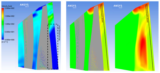 At the hub, instead, the axial velocities were equal to or less than zero. The measurement rake detected the fluid temperature coming from the exhaust, which was significantly smaller than that inside the blade channel.