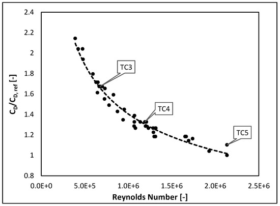 Lastly, starting from the measured data, the drag coefficient could be calculated according to Equation (7):
