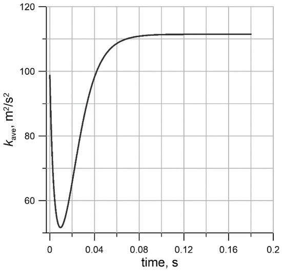 The problem of specifying the initial fields of the subgrid-scale turbulence parameters consistent with the resolved flow field is described in [13,16]. In [13], use of the Smagorinsky model is proposed [3] to determine the turbulent viscosity at each cell of the computational domain. Further, the subgrid-scale kinetic energy, k, is proposed to be considered as the difference between the total turbulence energy (obtained theoretically by integrating the one-dimensional spectrum provided from the Comte-Bellot and Corrsin experiment [30,31] over the whole wavenumber range) and the kinetic energy of the resolved scales. After that, the characteristic subgrid-scale frequency value can be estimated as . In our viewpoint, this method is relatively laborious. Moreover, it is worth noting that the procedure of obtaining a consistent initial field must be applied to all unsteady flows. This means that a more general approach is needed (especially in cases when total turbulence energy is unknown). In this paper, an original method based on [16] was used. To obtain the initial field, only the equations for the subgrid-scale turbulence parameters were solved (none of the rest of the flow parameters changed during the simulation); the fields of these parameters trended toward a stationary state consistent with the resolved velocity field obtained from the turbulence generator. However, the convergence algorithm was simplified; the approach to the stationary state was tracked using the subgrid-scale kinetic energy averaged over the computational domain. The field relaxation was not tracked, since it was found to reach a stationary state several times more quickly than did the field. Figure 2 shows the dependence of the volume-averaged subgrid-scale kinetic energy, , on physical time with use of a central-difference scheme and the standard value (see Section 1) on a mesh of 643 cells. The value was seen to significantly change during the first integral time scale, s. By the time equal to s, the value had almost stopped changing (changes occurred in the fifth significant digit). A similar behavior was observed for other values on the same mesh. As a result, it was decided to carry out this procedure up to a time equal to s, assuming that for this time period on any of the considered meshes and for any values of the subgrid-scale parameter field, there would be enough time to adjust to the initial resolved field. At the same time, each value of the constant corresponds to its own established value, .