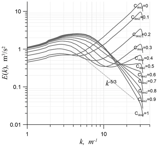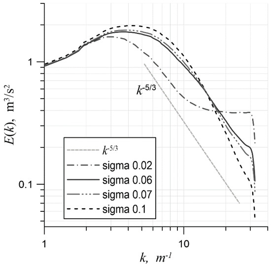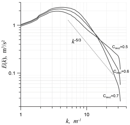 Figure 10 shows the spectra for several different values. At , an energy overshoot can still be seen in the short-wavelength region of the spectrum, and at , the scheme had already turned out to be excessively dissipative. Simulations with values of equal to 0.06 and 0.07 were close to the correct slope of the spectrum. The fact that the threshold value turned out to be very small () suggests that the optimal values of obtained above are relevant only to those schemes whose behavior is very close to that of the central difference. When the approximation of the convective term reaches 6–7 percent of the upwind scheme, the coefficient in the simulation should be assumed to be equal to 0.