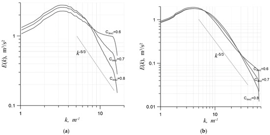 Figure 6 shows the spectra obtained at various values of on a mesh with 643 cells. It can be seen that as increased, the level of dissipation in the short-wavelength region of the spectrum became larger due to growing influence of the subgrid model. Visually, the theoretical slope corresponded to values and ; however, according to the method described above, for both cases, the error exceeded the specified threshold of . As a result of a parabolic interpolation, the optimal value of turned out to be . It is worth noting that in [16], the optimal value of the constant was equal to . This difference can be explained by the fact that VTM averaging was not used in [16] (Figure 1). This led to a decrease in the value of in a certain set of cells; this was compensated by an increase in . It is worth noting that regardless of the local VTM averaging, the global average values over the computational domain were close to 1: and . Meanwhile, the optimal values of the constants differed by a factor of 1.7.