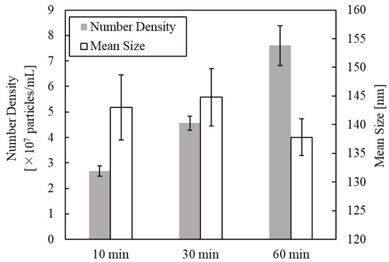 The number densities and mean sizes of the UFBs were measured to determine whether the bubbling time increased the number density of the bubbles and whether adding electrolytes altered the fundamental properties of the UFBs. The number densities and mean sizes were determined from the particle size distributions of the UFBs obtained through a nanoparticle tracking analysis (NTA) (NanoSight, Malvern Panalytical Ltd., Malvern, UK). In NTA, the Brownian-motion tracks of the nanoparticles are visualized through the scattered reflections of laser light and the size of each nanoparticle is computed [20].